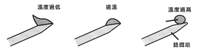 錫是低溫易熔及易老化的焊料,溫度低時,錫呈現膠狀不黏,令線路 板的銅箔與零件腳造成假焊。溫度正確適中時,在焊咀的錫呈半圓粒狀,有反光面,是黏著力最佳的時候,迅速將零件腳與底板電路焊接。溫度過高時,錫呈圓粒 狀,錫點表面的色澤呈啞色,有縐紋,表示錫已老化,會造成假焊點出現。所以,從鉻鐵咀的錫粒形狀可知何時焊接是最好的時候,制作的成功率是怎樣。